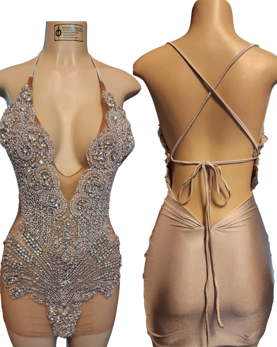 The Jessi mini halter dress will be your favorite party dress. Whether it's for your birthday or another event, you'll be sure to sparkle with every move. Option to add feathers. Dress is customized made to order. It will be 2-4 weeks processing time. Rush orders available. Contact us for specific order time.