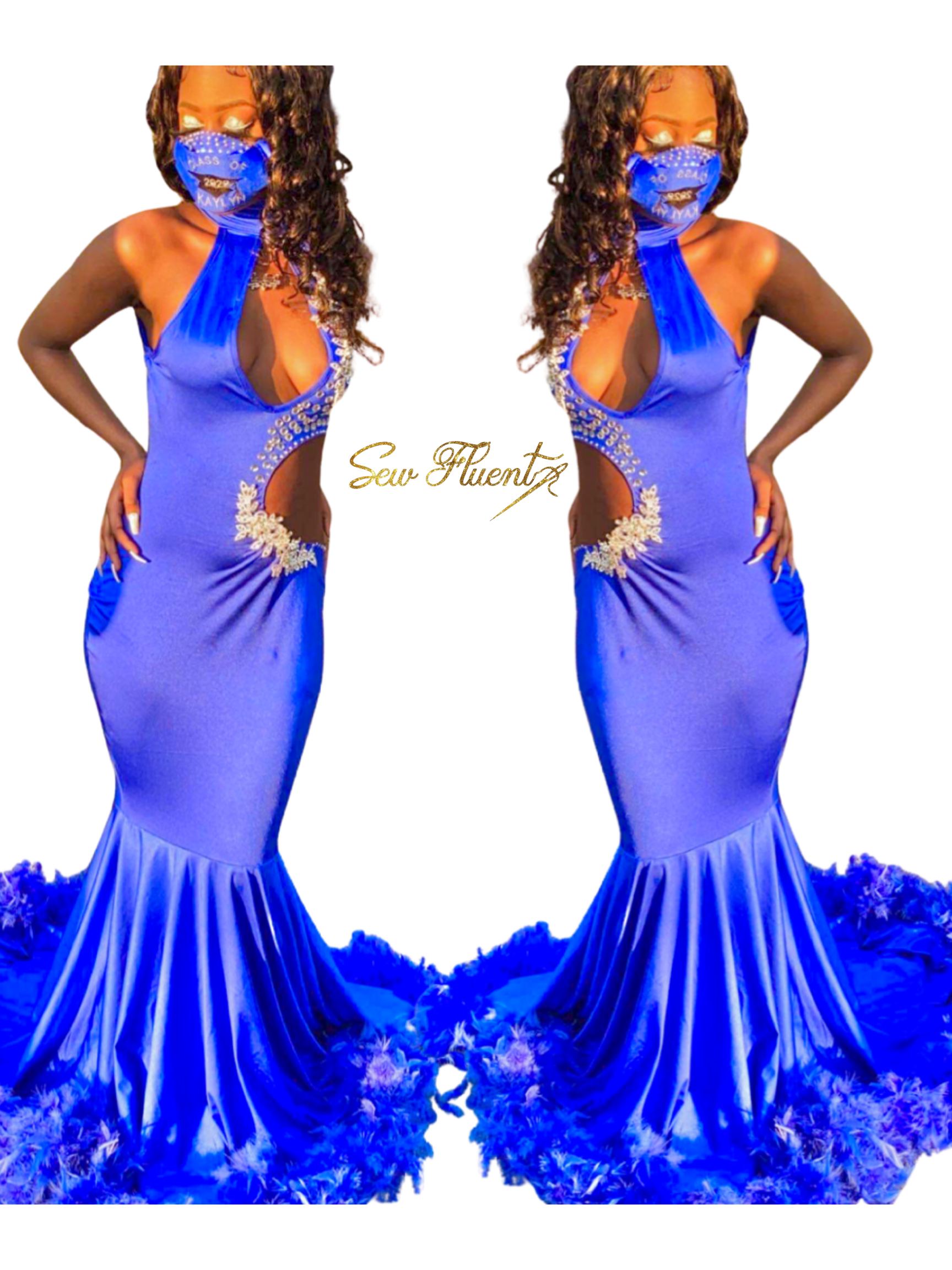 The " Keli" mermaid gown is beautiful and elegant. It features a side opening embellished with beautiful stones. This dress features ostrich feathers on the train and can be made in different colors and styles. This is a made to order item and will ship in 2-3 weeks. Please order within this timeframe to ensure correct delivery times for your event.